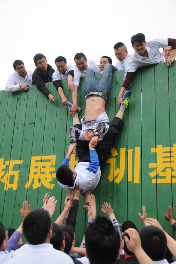 下午的拓展項目更是“體驗升級”,“卓越圈”項目讓人意識到從優(yōu)秀到卓越不是一蹴而就的,是一個(gè)曲折的過(guò)程,是一個(gè)不斷超越的過(guò)程,在一輪一輪挑戰5.4秒這個(gè)終極時(shí)限的過(guò)程中,我們的年輕干部們磨傷了手、劃傷了臉、蹲酸了腿,任灰塵在身邊沸騰,任汗水在臉上流淌,他們都沒(méi)有退縮一步,不斷的嘗試、改進(jìn)、再?lài)L試、再改進(jìn),最終,5.21秒這個(gè)卓越的成績(jì)被記錄在了成績(jì)冊上,大家歡呼雀躍。到了最后的挑戰了,“畢業(yè)墻”垂直立于地面,沒(méi)有輔助設施,沒(méi)有輔助人員,大伙兒覺(jué)得需要1.5小時(shí)這47名學(xué)員才能全部翻過(guò)這面墻——4.2米高的墻。按照教練的指導,做基礎的、做輔助的、做保護的、做拉手的,自發(fā)輪流上陣,伙伴們一個(gè)一個(gè)互相拉扯著(zhù)翻越了畢業(yè)墻,他們中有人肩膀被踩破了,有的肌肉僵硬了,有的手臂勒紫了,但都沒(méi)有吭一聲,只想著(zhù)讓所有的伙伴全都快速翻過(guò)墻,堅持不懈的精神在他們中不斷傳遞著(zhù)……終于他們創(chuàng )造了一個(gè)自己都沒(méi)敢想的奇跡,15分49秒51,所有47人全部完成了翻越!